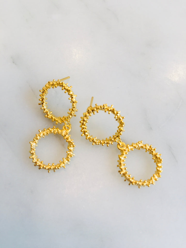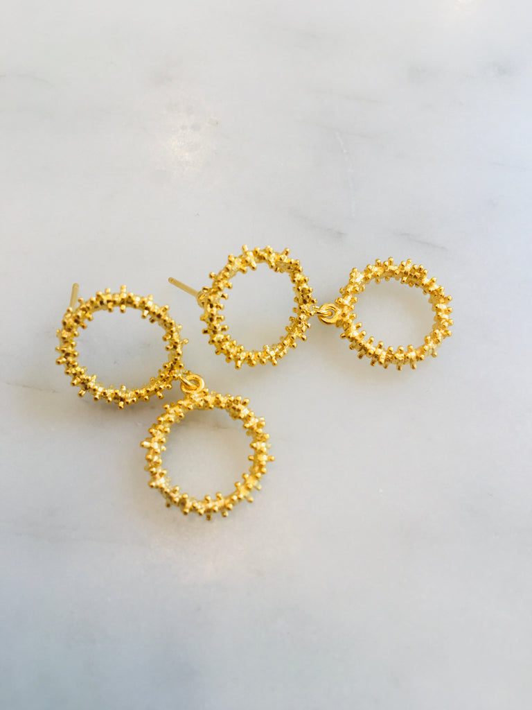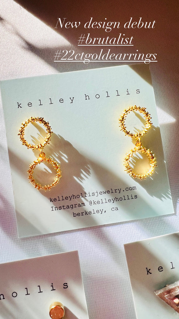 My latest original to me design in 22ct gold over silver. Gorgeous brutalist earrings, 1.25” drop. Two lovely brutalist style circles form lovely drop earrings in a style both retro and distinctively modern. Great on their own or paired with vintage statement necklaces like the Atomic Starburst.