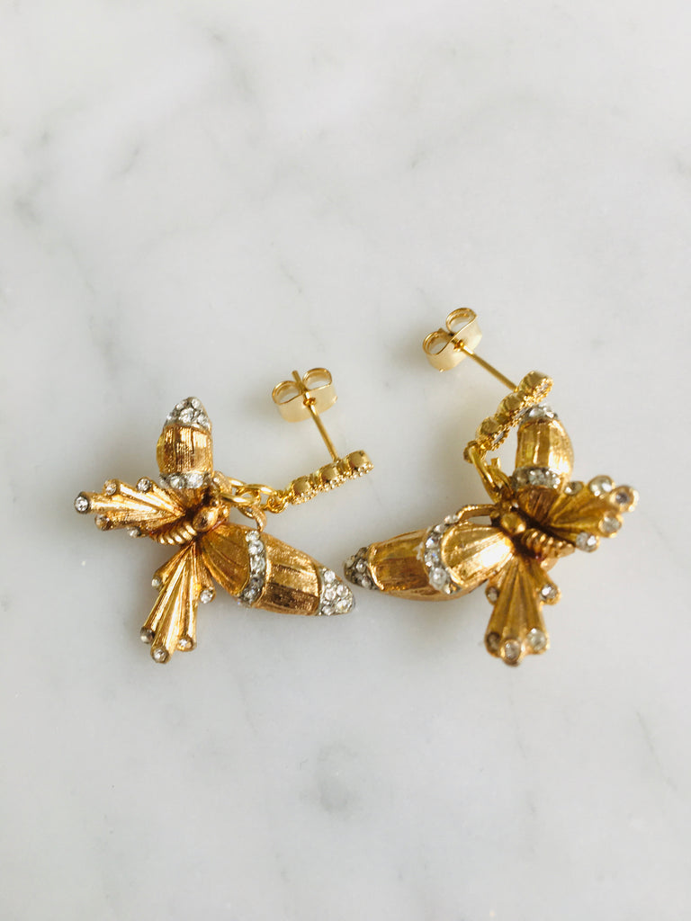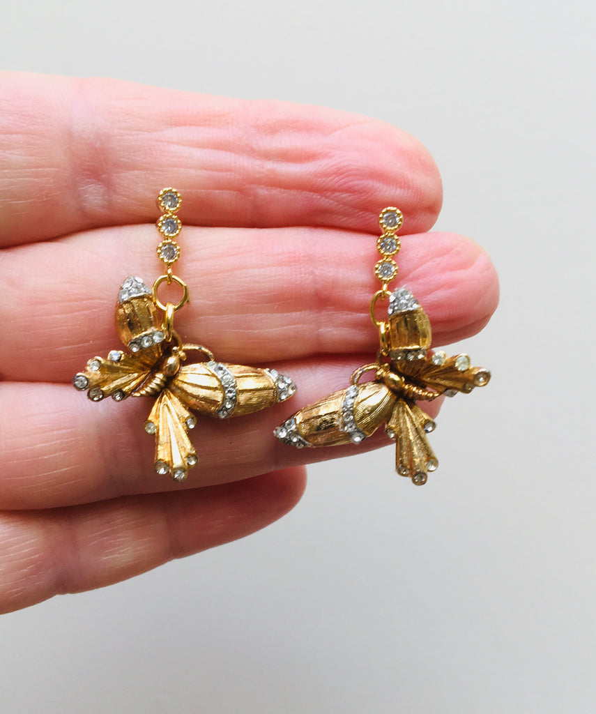 These earrings were originally screwback earrings circa 1940s by Marvella. Reset as pierced earrings with 22ct gold vermeil posts. The butterflies are graceful with assymetrical wings capturing them inflight. Tiny rhinestones accent the gold wings. CZ set on posts. Total length 1,” .75” at widest point.