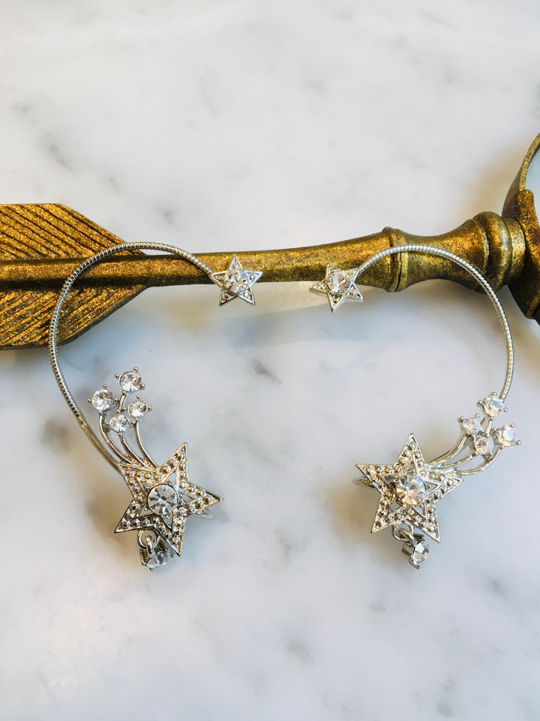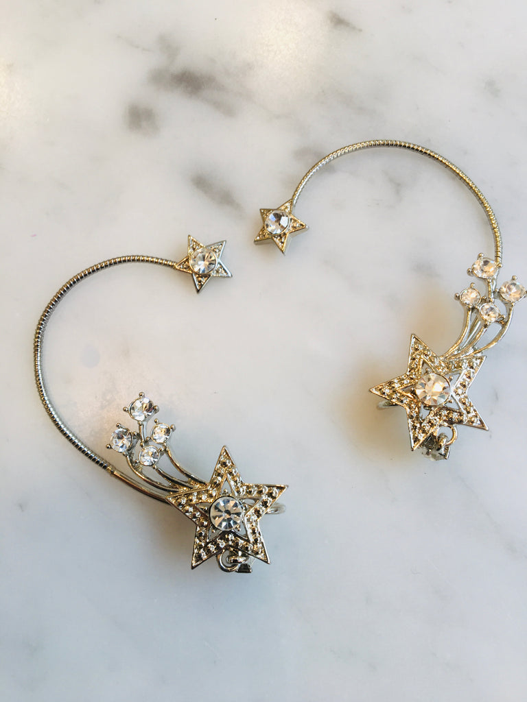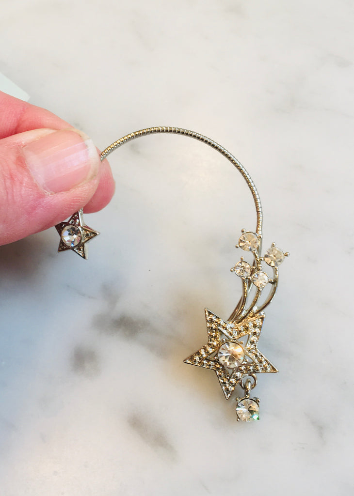 Silver vintage ear wire set perfect for pierced or unpierced ears. Beautiful art deco styled starburst with rhinestone drop, topped with star in the upper ear curve.