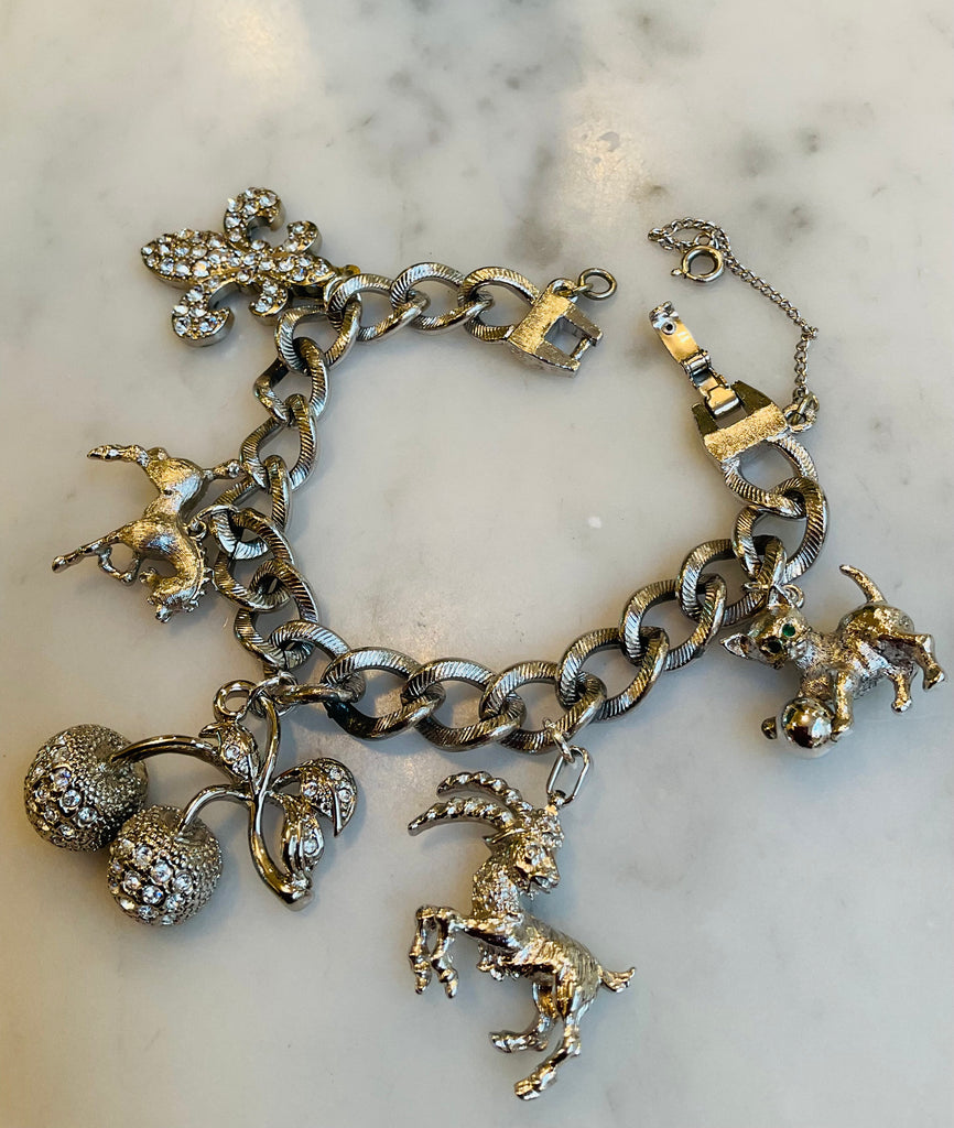 Beautiful 1959s charm bracelet with twist curb links. Gorgeous horse, fleur de lid, cherries, kitten and Posieden charms. Fold over clasp with additional safety clasp. 7” length.