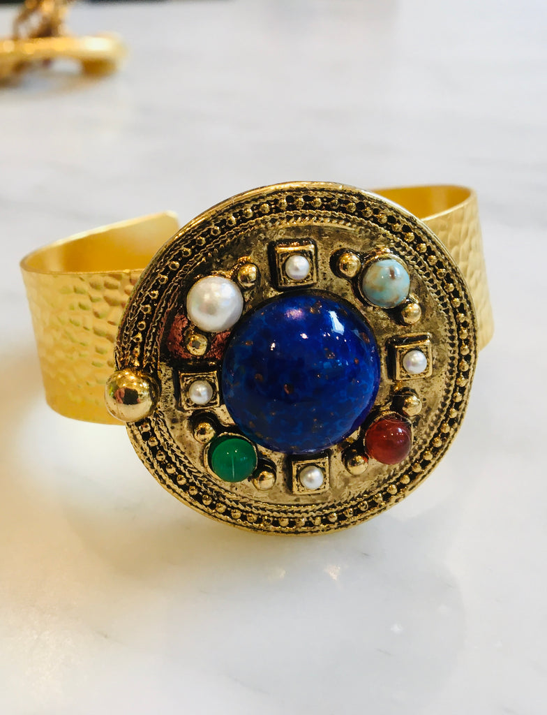 Stunning midcentury Byzantine style bracelet with hammered gold vermeil cuff. Cuff is 1” in width and Byzantine focal piece is 2” in diameter. Set with stunning lapis, turquoise, jade and carnelian glass. Fully adjustable to accommodate all wrist sizes.