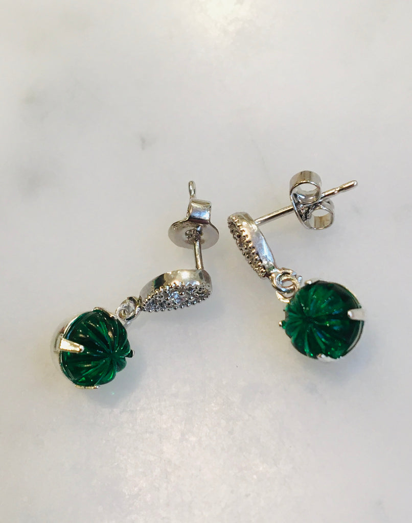 The most gorgeous pair of petite vintage sterling silver earrings to add a spark of brightness to your day or evening. Sterling silver CZ set posts suspend delicate mogul shape emerald glass set in sterling silver. Emerald glass drops circa 1930s during the artisan era of molded glass jewelry. Total drop at .5” and featherlight.