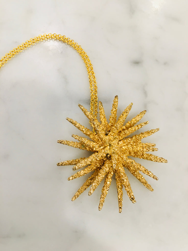 This gorgeous raw edged midcentury starburst is both an exquisite example of brutalist, and a testament to the creative artistry of Marcel Boucher. 2” in diameter this is a truly stunning statement necklace that is reflective of the period in which it was made-1940s, yet remains completely modern in style. 22ct gold over silver this stunning piece is set on a 22ct gold vermeil chain.