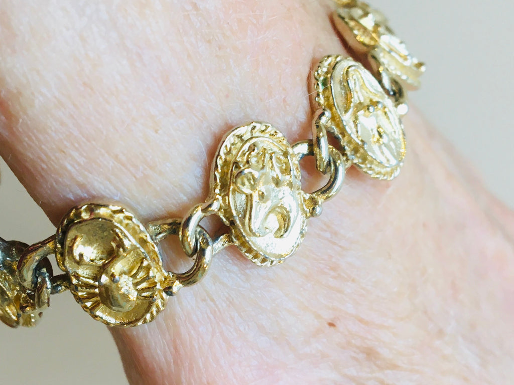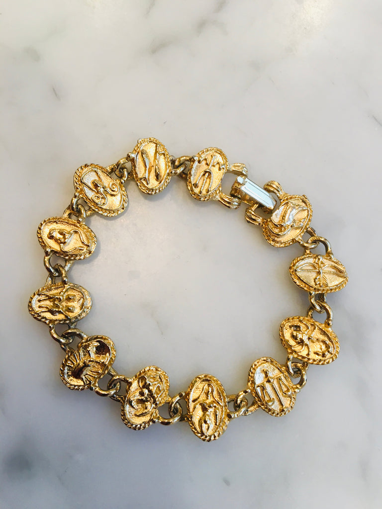 Beautiful linked charm zodiac bracelet with graceful raised detail star signs. Bracelet is 7.5” and in total length for a graceful drape on the wrist. .5” wide.