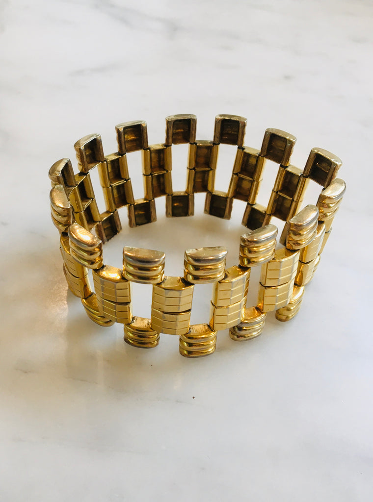 This is such a favorite piece. Gorgeous articulated quad layered link bracelet in 12k gold. Bracelet is 1.25” wide for a striking bold statement. Flows beautifully on the wrist. Bracelet by Kreisler circa 1930s.