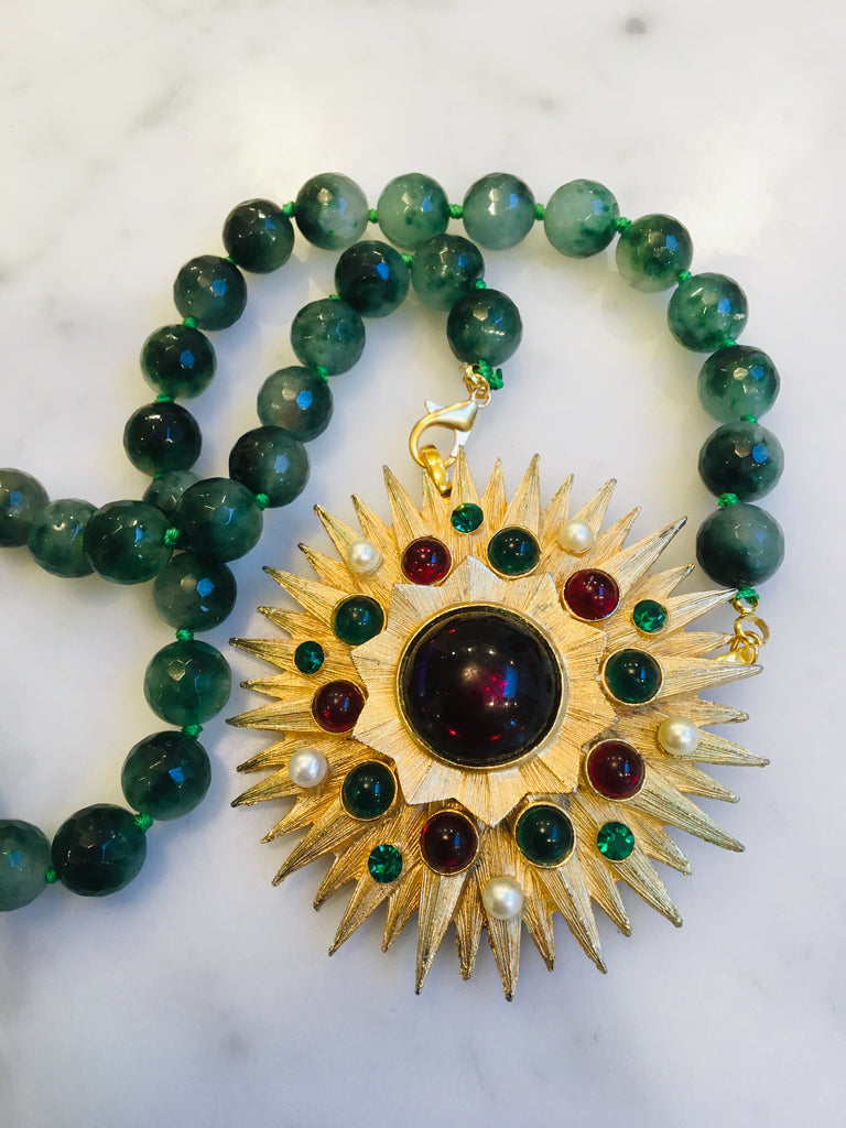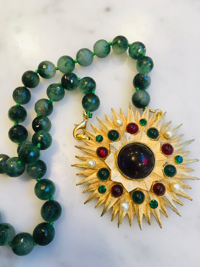 Soectacular statement necklace 3” in diameter set with hand knotted 12mm beads. This is a true statement necklace. Starburst brooch circa 1950s, reset as a center piece in this jade necklace, starburst set with richly hued glass stones.