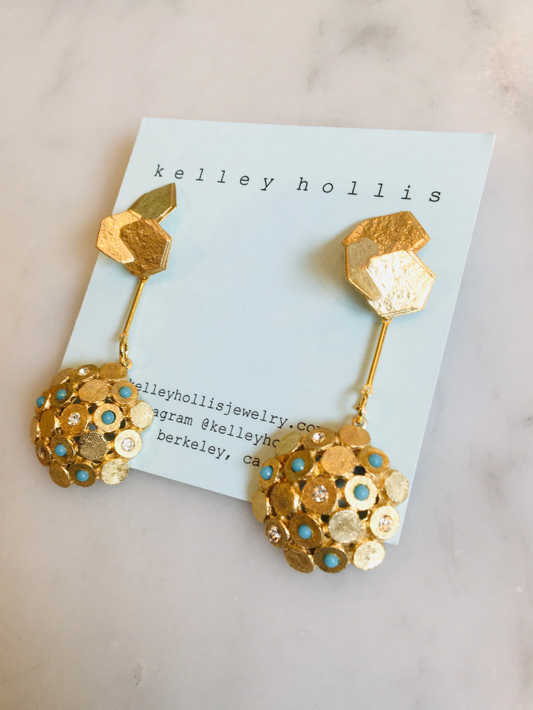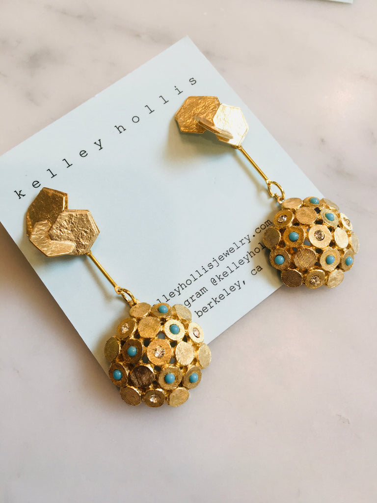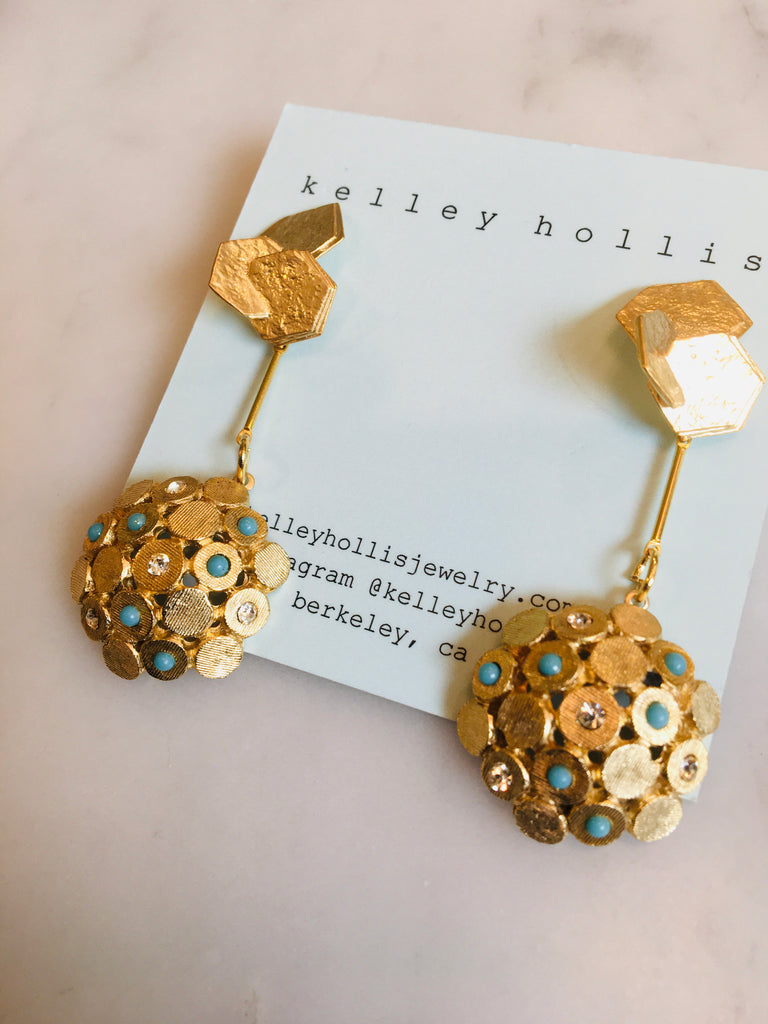 One of the most stunning pair of earrings ever. These bold 1950s brutalist earrings with round textured gold nuggets set with turquoise beads and rhinestones. 22ct gold over silver arm attached the vintage earrings to 22ct gold vermeil posts.